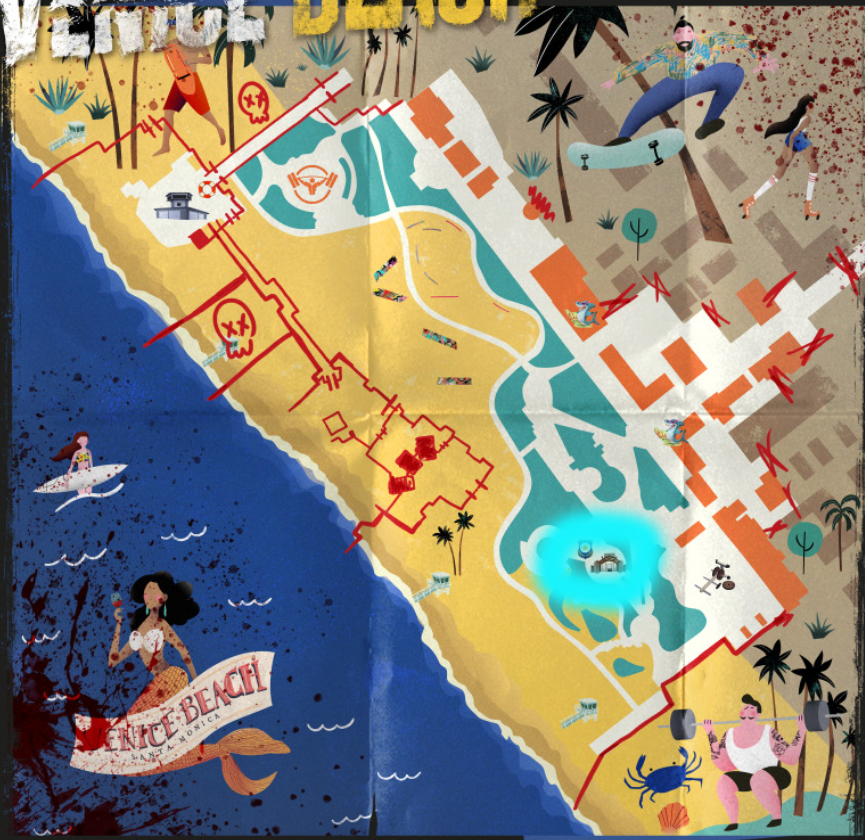 Vous trouverez le commissariat local de Venice Beach un peu plus au sud vers la plage. Pour vous aider, voici son emplacement sur la carte :