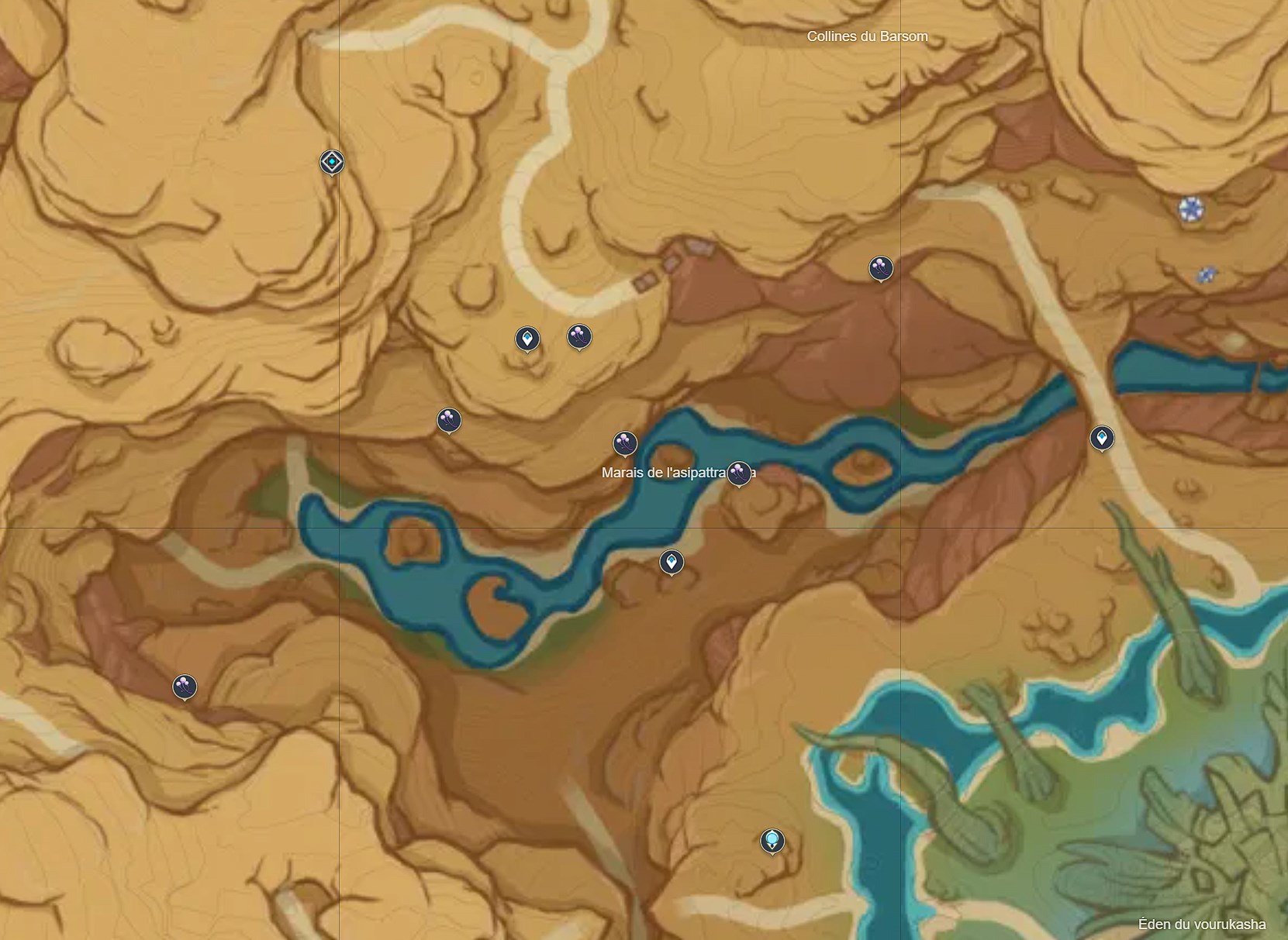 rendez-vous au Marais de l’asipattravana dans le désert de Sumeru et vous allez devoir chercher sur place des sortes de cœurs visibles sur les montagnes. Voici d’ailleurs une carte