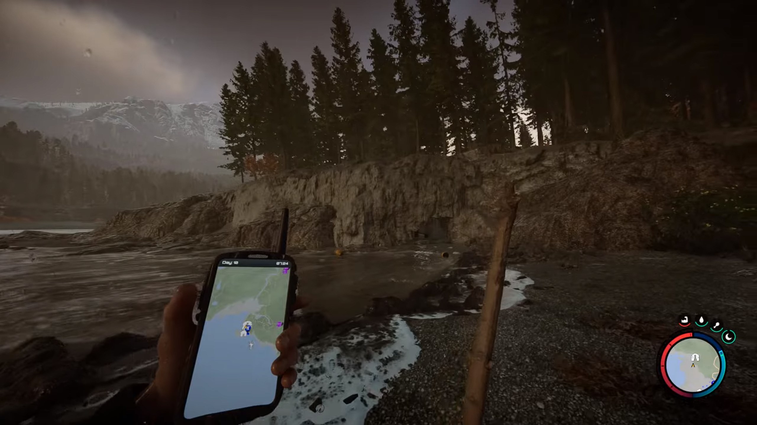 Allez à l’emplacement de la flèche jaune visible sur ce téléphone pour trouver la grotte contenant le masque de plongée dans Sons of the Forest – source :