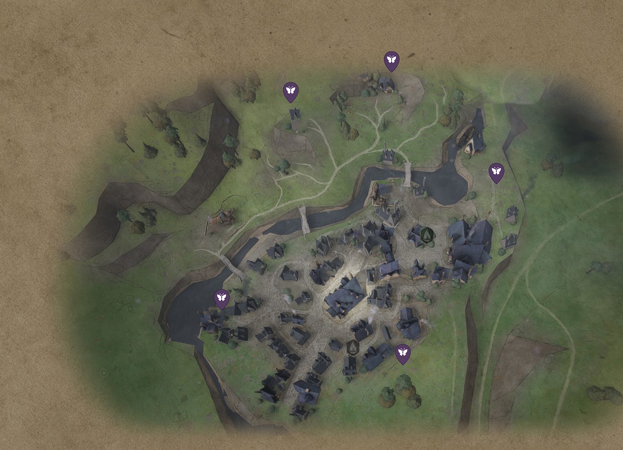 Les miroirs aux papillons se trouvent au niveau des bulles violettes (crédits : Map Genie.io)