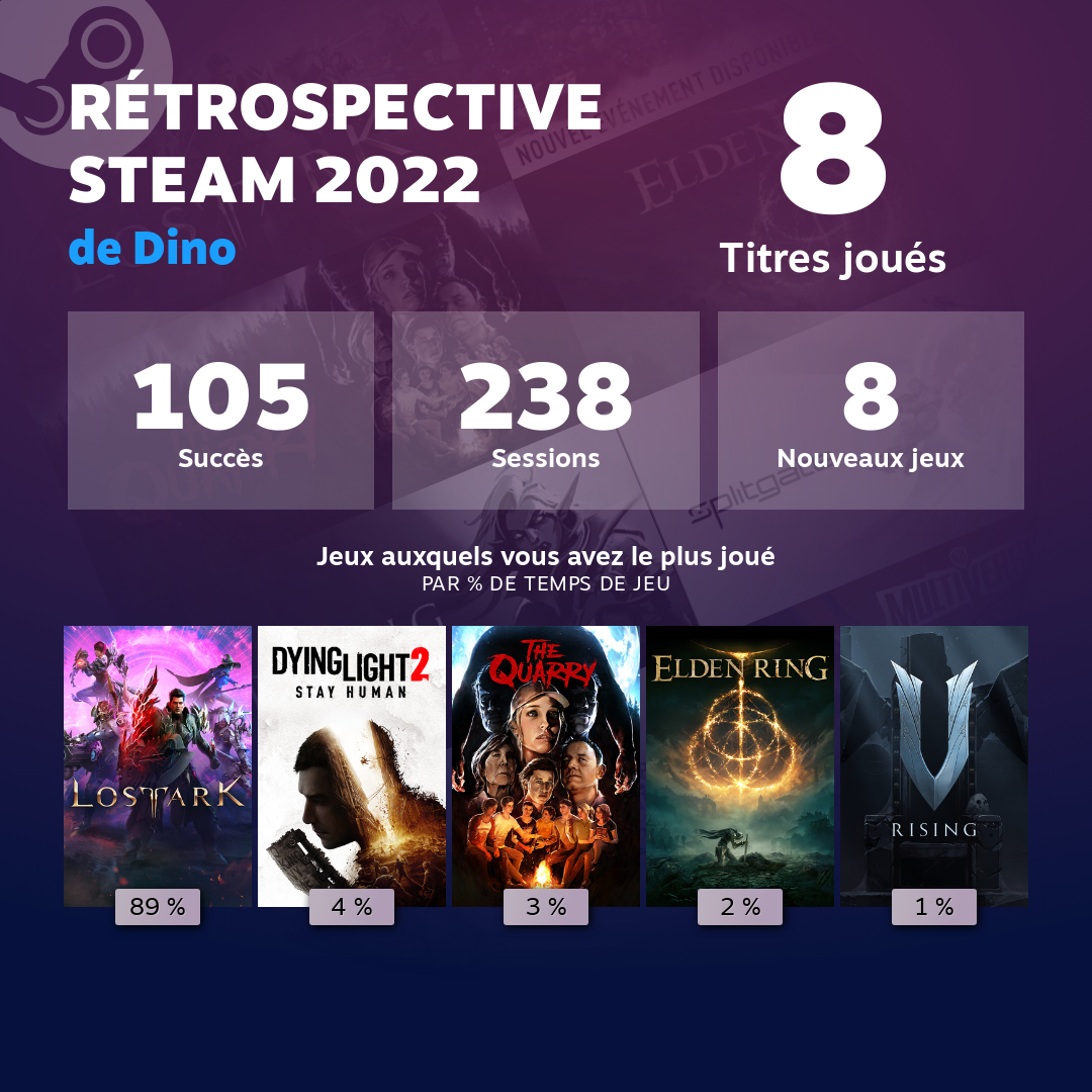 vos identifiants Steam afin de pouvoir accéder à votre récap 2022. Une fois connecté sur le lien que nous vous avons mis à disposition ci-dessous, vous obtiendrez votre rétrospective comme vous
