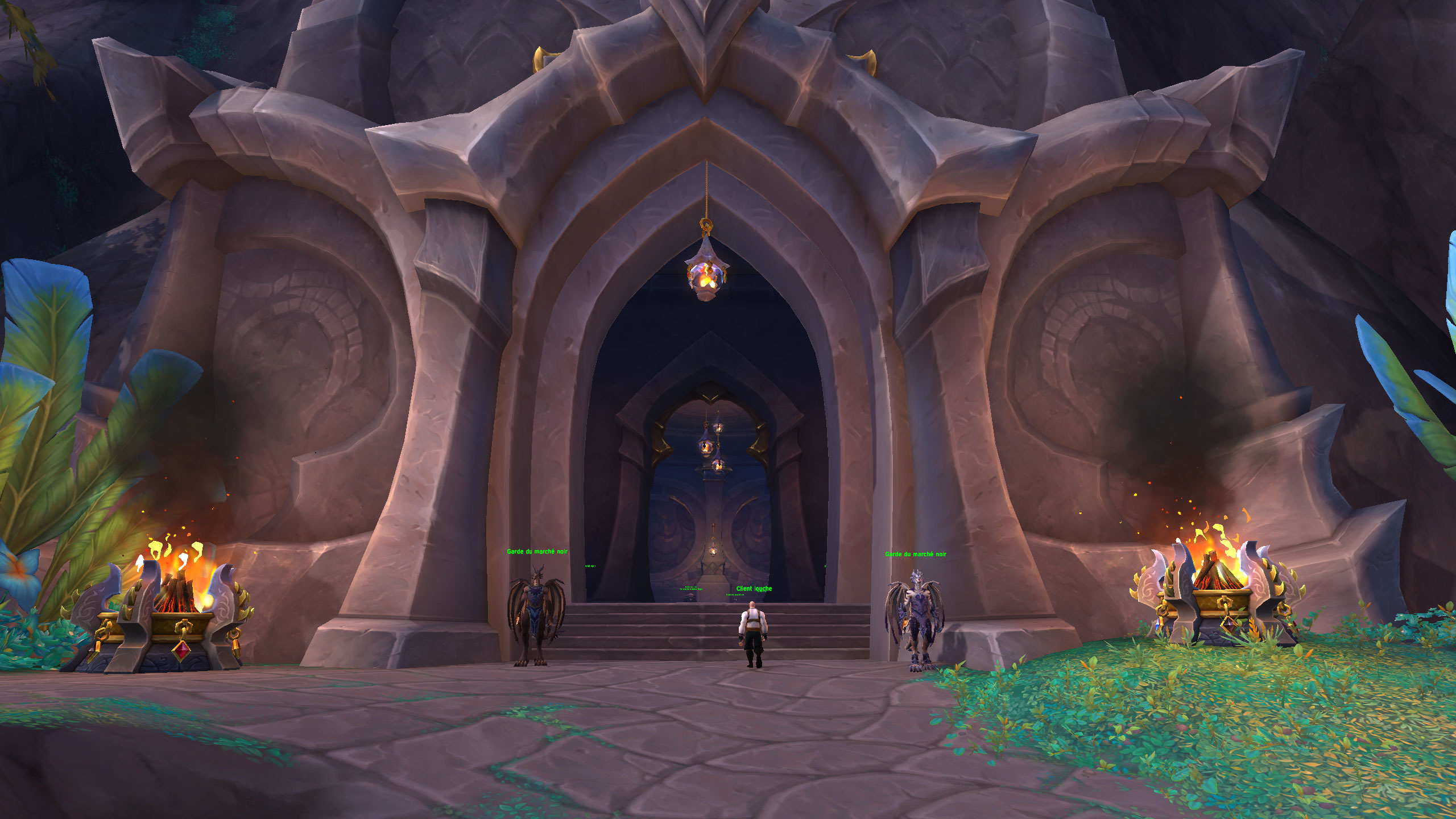 Voici l’entrée du marché noir gardé par deux Dracthyr, vous voyez également un client louche qui y rentre.