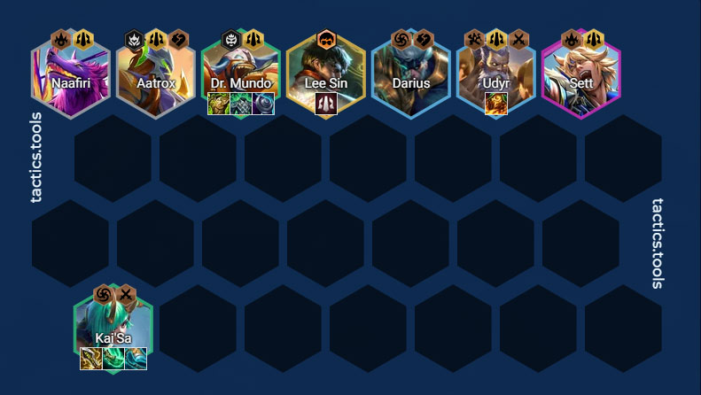 supplémentaire. Au départ, Kalista et Naafiri peuvent porter les objets destinés à Kai’Sa et Dr. Mundo plus tard dans la partie, ce qui permet de conserver une bonne puissance de combat avant d’obtenir les unités