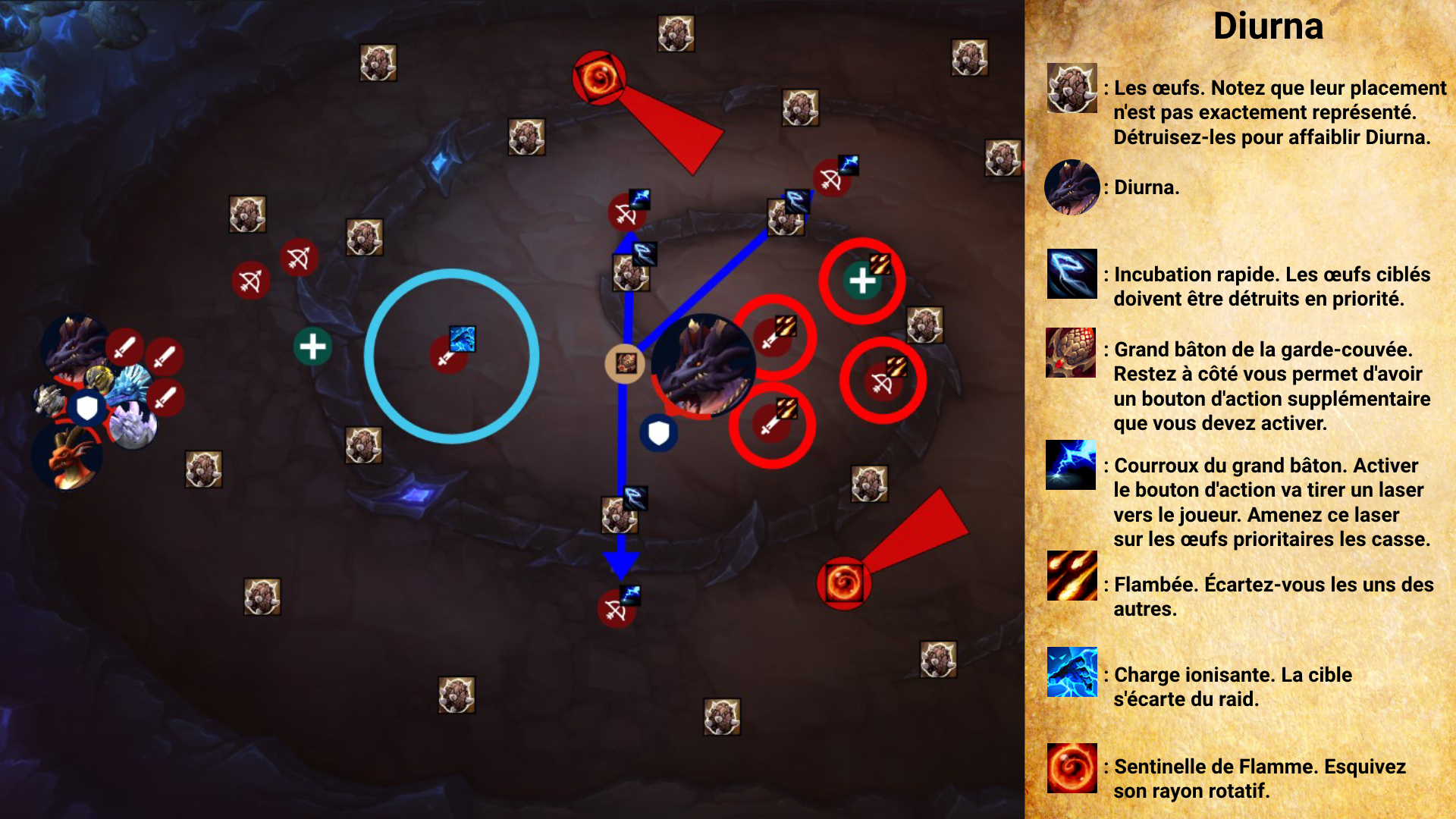 Si vous placez les adds qui apparaissent proches de Diurna, ils gagnent Lien de la garde-couvée et sont plus difficiles à tuer. Vous pouvez soit les écarter du boss pour éviter cette interaction, soit les mettre ensemble avec le boss pour