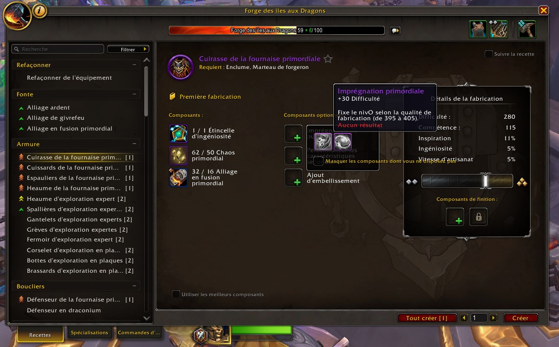 objets 395 à 405 ilevel. - Les imprégnations primordiales concentrées récupérables en Mythique + 20 et en raid Mythique qui permettent de faire des objets 408 à 418 ilevel.