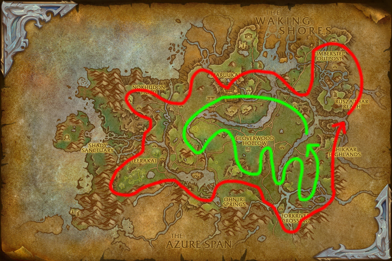 La route verte est plus courte et plus dense, vous trouverez plus de minerai et vous demande moins de compétences en vol de dragon, il est préférable de commencer par la verte