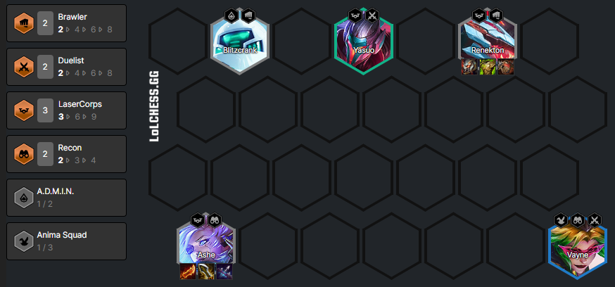 Vous pouvez slow roll au niveau 5 pour Ashe / Renekton / Blitzcrank 3 étoiles, ce qui vous donne un bon DPS physique et une bonne frontline. En