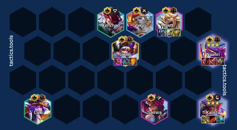 Après avoir sécurisé Kalista 3 étoiles, on monte niveau 7 puis 8 pour ajouter Lux, Sett, Samira, Gwen ou