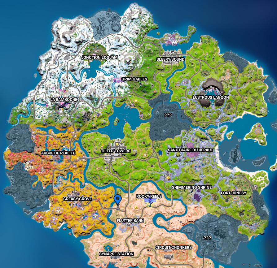Pour réussir cette quête, vous devez atterrir au bois flottant. Il s’agit d’un nouveau lieu-dit qui se situe au sud de la carte du Fortnite. Si vous ne voyez pas le nom sur votre carte c’est