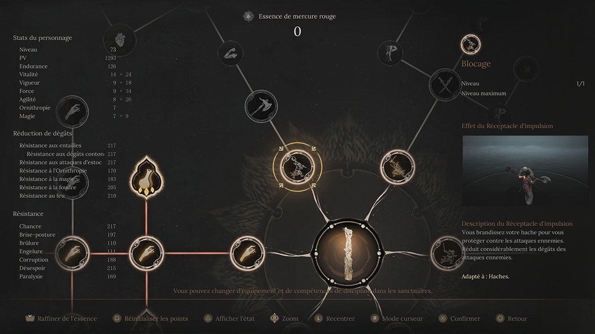 Le blocage est possible uniquement si vous utilisez une hache, une arme lente mais puissante. Contrairement à l’esquive, bloquer vous permet d’encaisser un ou plusieurs coups sans
