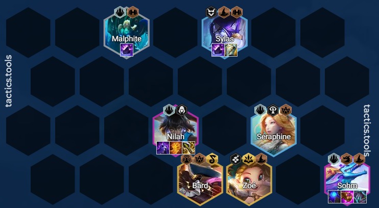 La version standard de cette composition se joue en 6 Lagons / 3 Mages. Elle mise sur Sohm en carry principal pour infliger beaucoup de dégâts magiques,