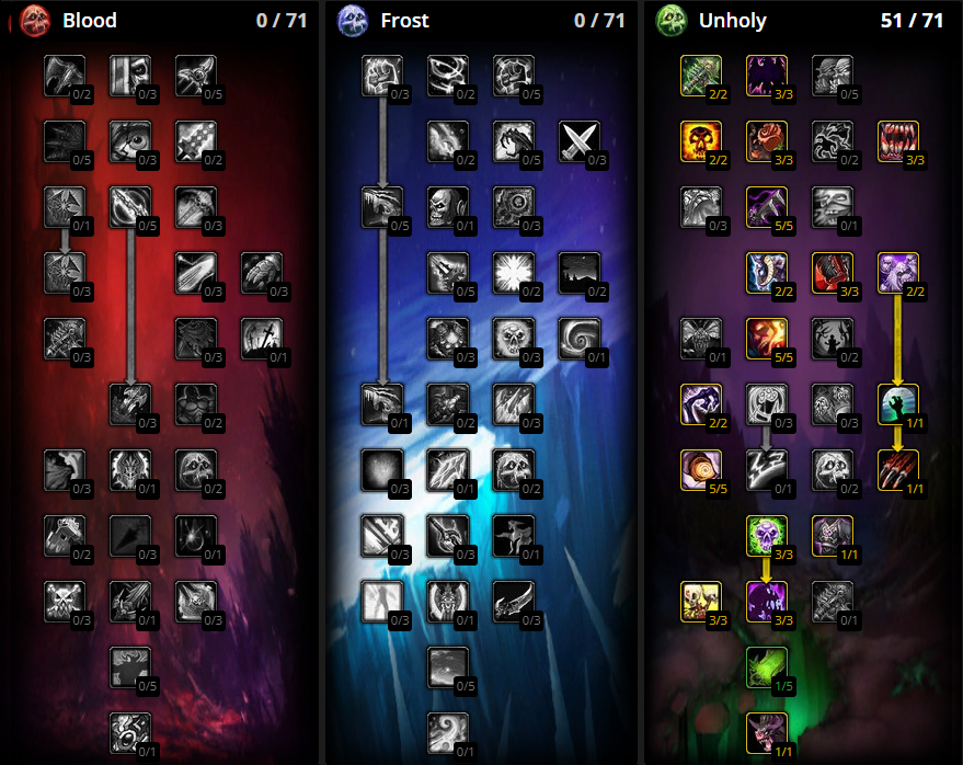 puisque vous disposez de soin personnel important avec Frappe de mort. Pour cette raison, nous allons vous présenter un arbre de talent pour chaque spécialisation pour pex votre Chevalier de