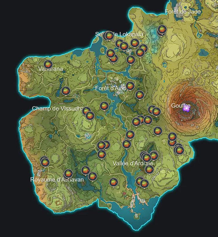 Sumeru. Ils sont trouvables un peu partout dans la région. Pour en trouver plus facilement, vous pouvez consulter l’image ci-dessous issue de la carte interactive de