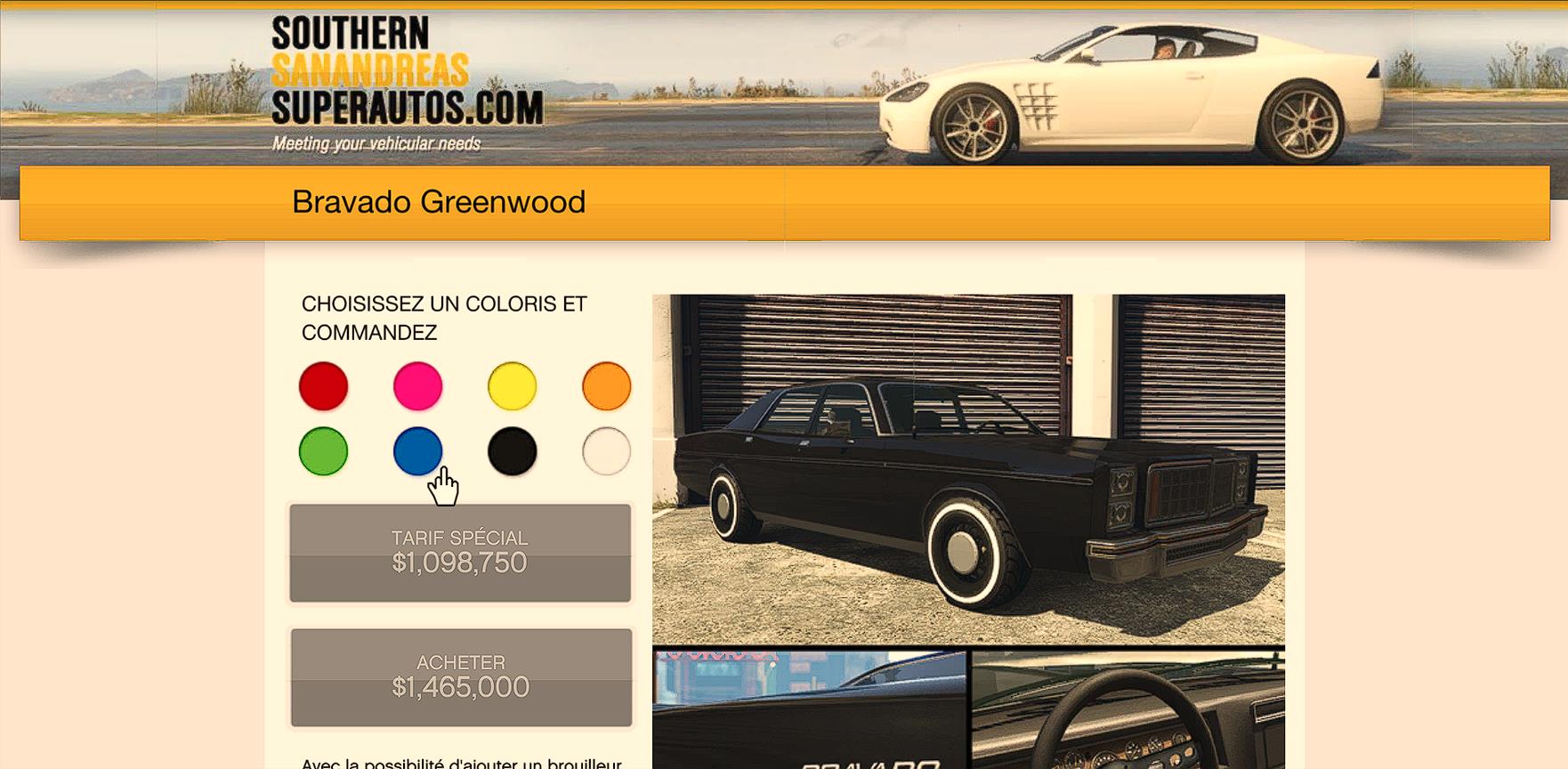 Chez ce concessionnaire, vous n’allez pouvoir acheter qu’une seule nouvelle voiture, la Bravado Greenwood. Deux tarifs sont proposés, à savoir :