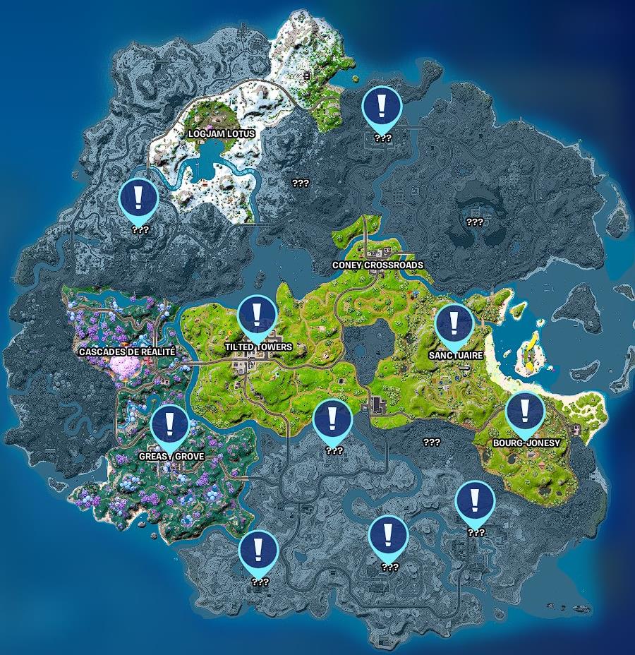 Les différents PNJ de la saison 3 du chapitre 3 se trouvent aux emplacements des bulles avec un point d’exclamation (crédits : Fortnite)