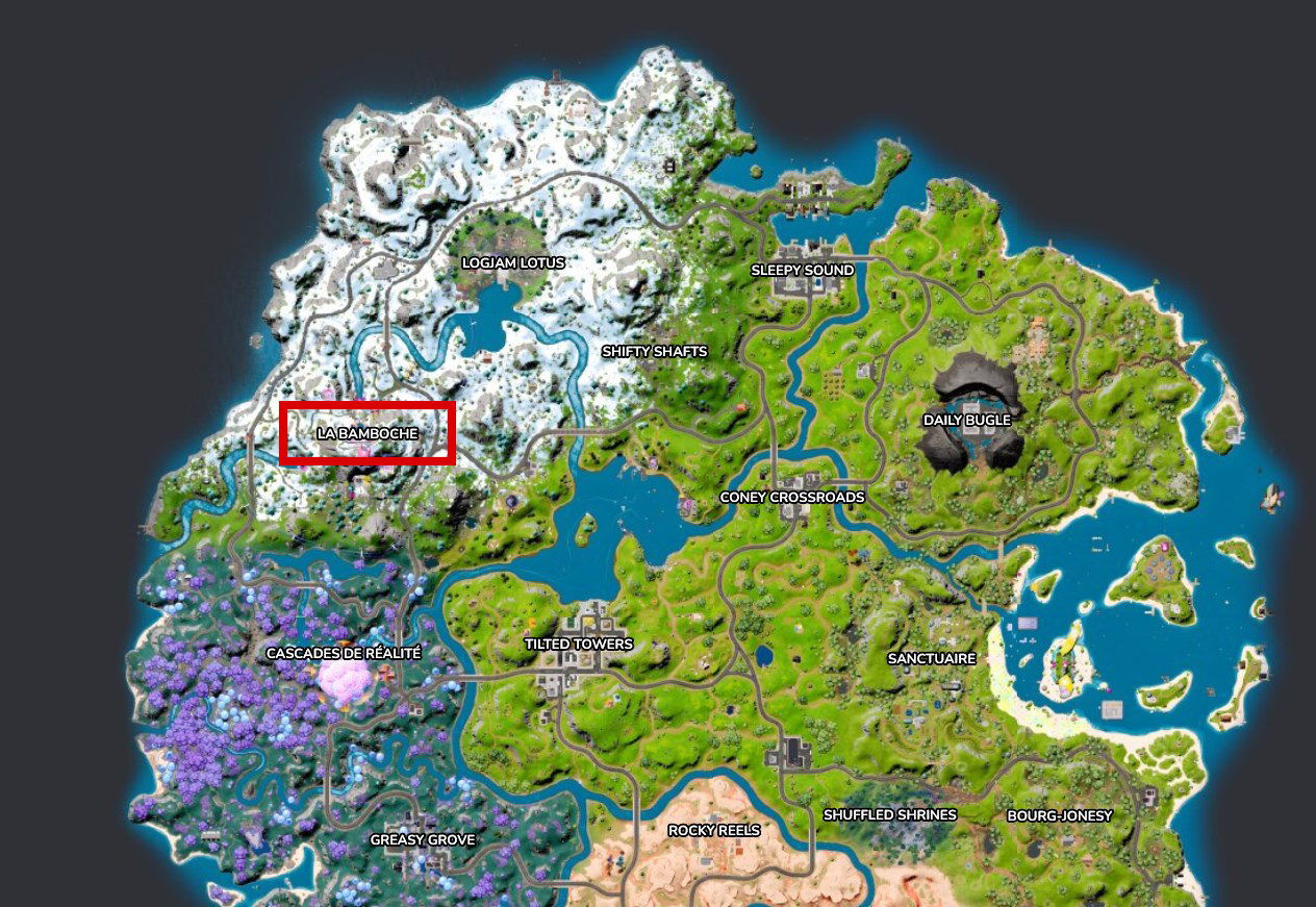 Pour réaliser cette quête, vous devrez commencer par vous rendre à la Bamboche. C’est un lieu qui apparaît sur la carte du jeu et qui a été ajouté très récemment dans Fortnite.
