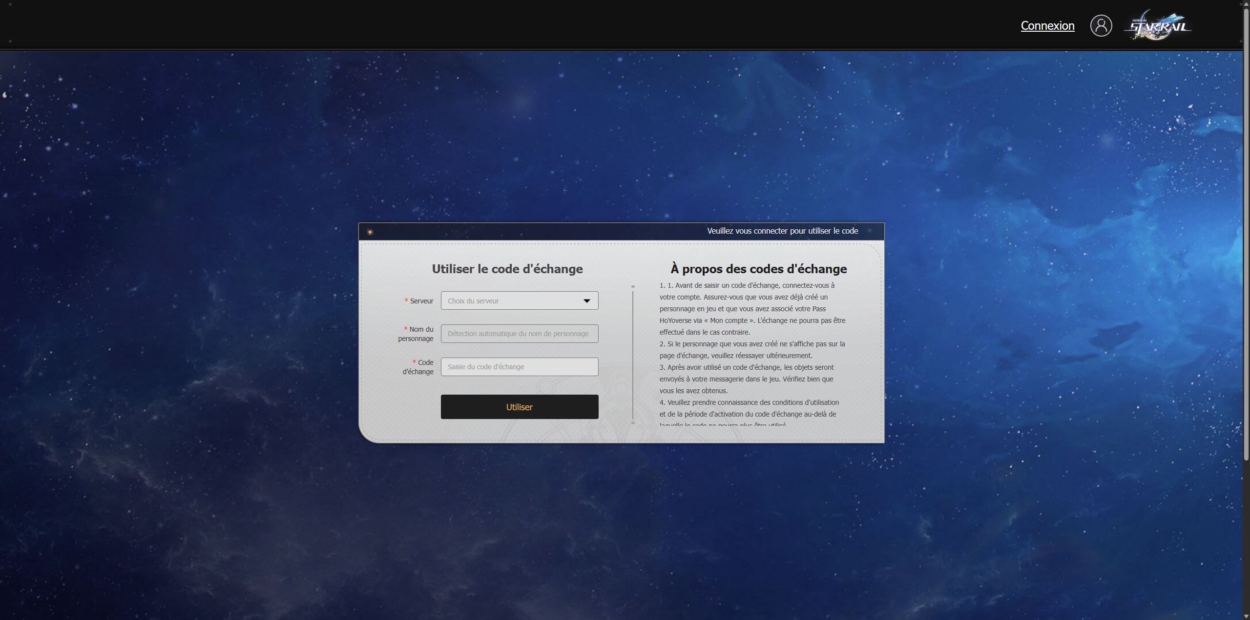 Une fois sur le site, vous n’avez qu’à vous connecter à votre compte HoYoverse pour voir directement que le personnage et le serveur sont marqués. Vous n’avez plus qu’à entrer le