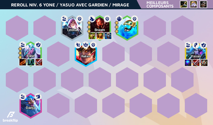 La composition Yone et Yasuo Reroll avec Mirage et Guerrier (Warrior) de Teamfight Tactics est une des compos