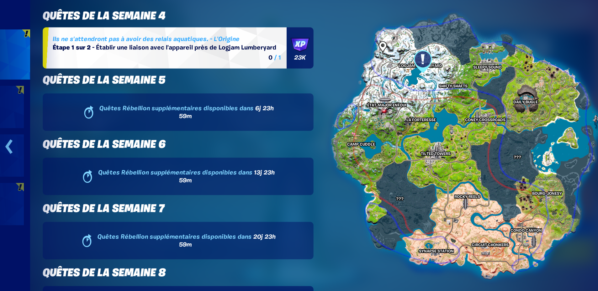 Etablir une liaison avec l’appareil près de Logjam Lumberyard dans Fortnite, défi saison 2 chapitre 3