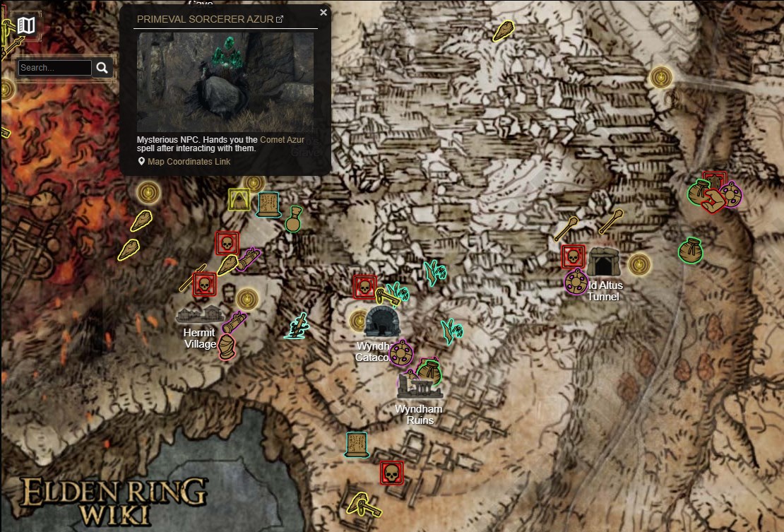 Emplacement du Sorcier Azur dans Elden Ring (crédits : carte interactive du Wiki Elden Ring)