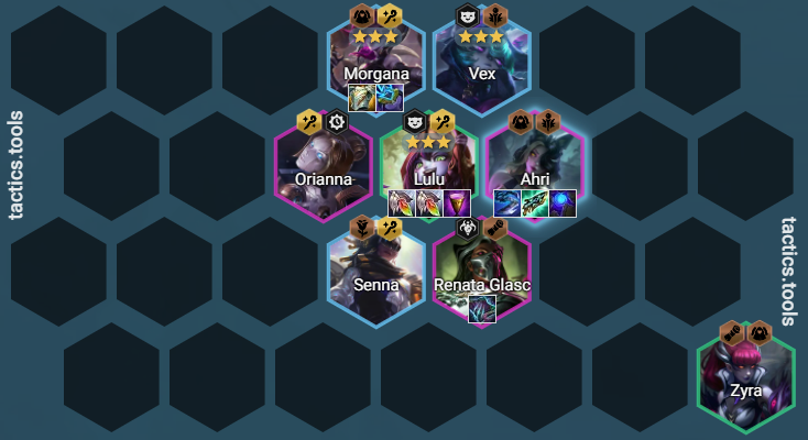 Lulu : Toute cette composition repose autour du fait que la Rédemption soigne en zone les champions adjacents au porteur et que le soin est amélioré par les Enchanteurs.