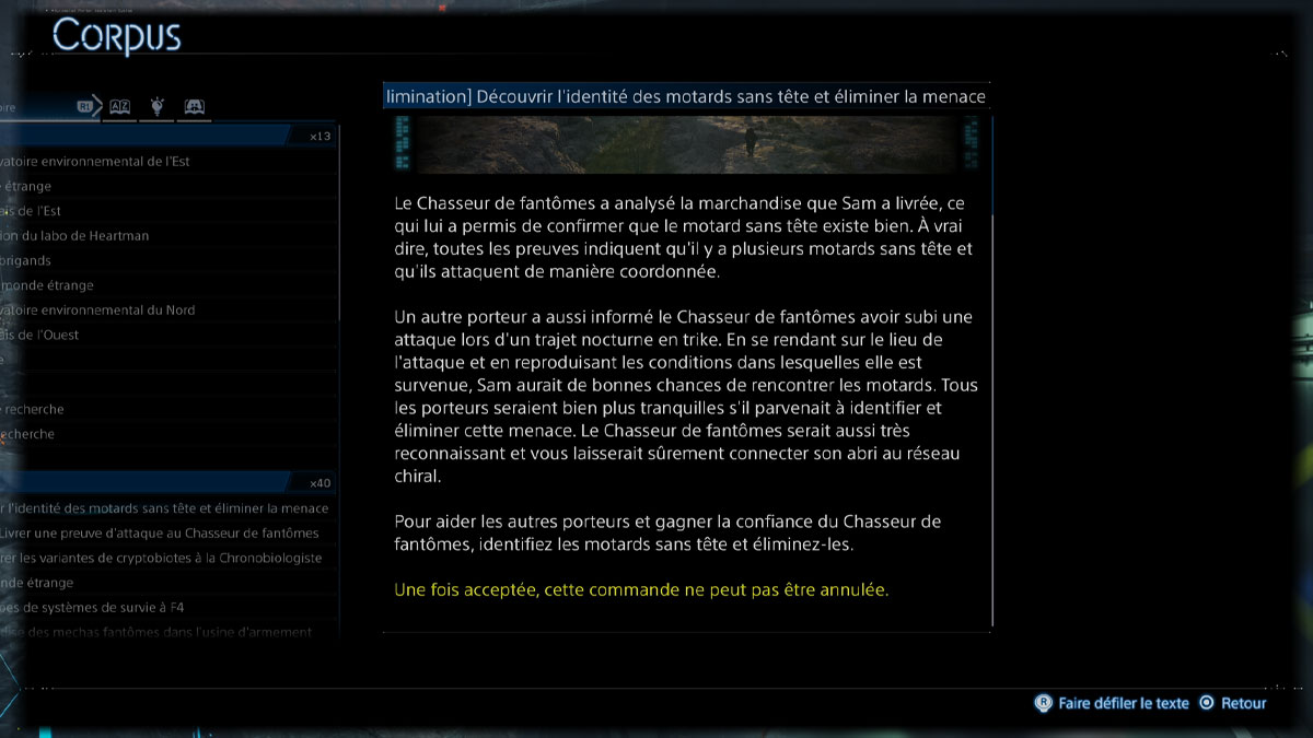 je vous recommande de faire, il y a la commande n°110 [Élimination] Découvrir l’identité des motards sans tête que vous pouvez trouver auprès du Chasseur de fantômes.