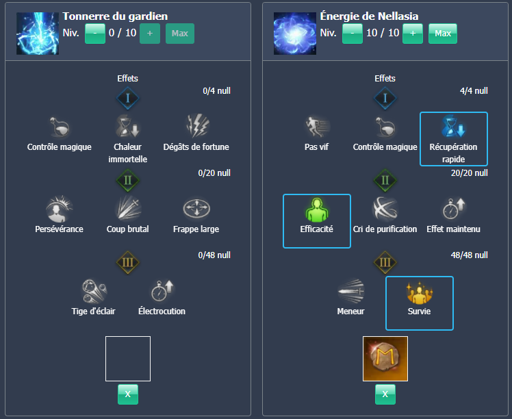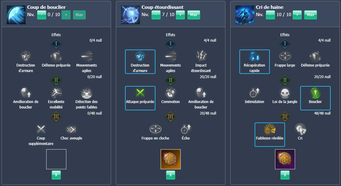 Pensez aussi à mettre une gemme d’annihilation de niveau 7 sur les compétences citées précédemment, sauf sur Coup étourdissant, Cri de haine et Énergie de Nellasia. Enfin pour ce