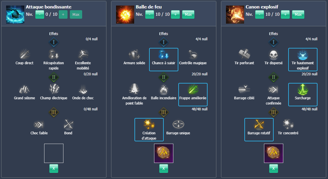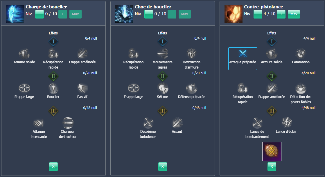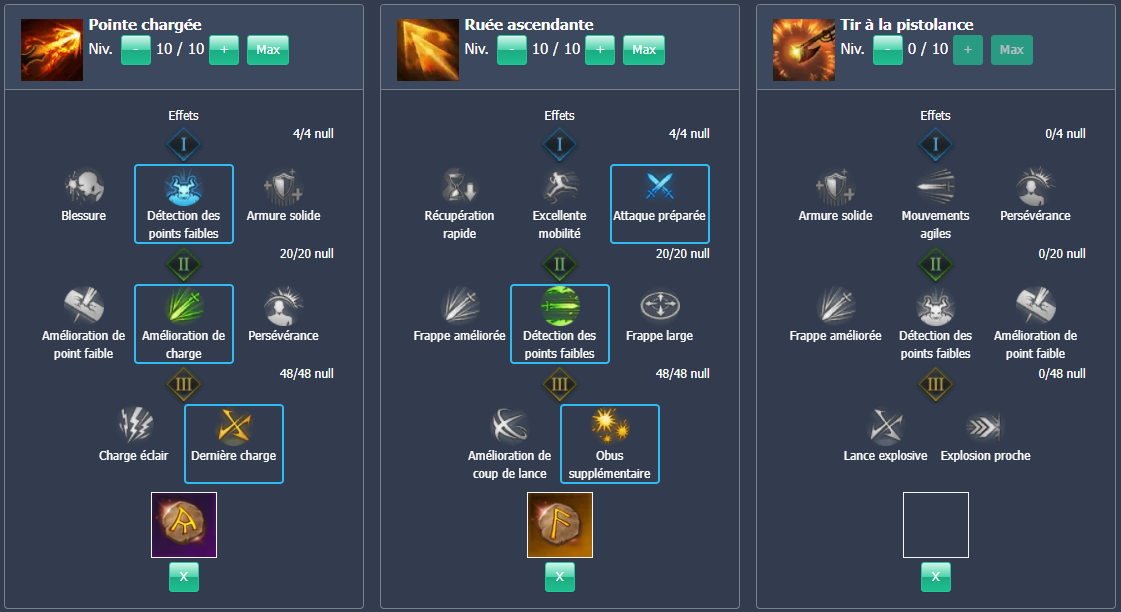 | Charge lourde | Les compétences de charge se chargent 8 à 40% plus rapidement. Les dégâts sont augmentés de 4 à 20% |