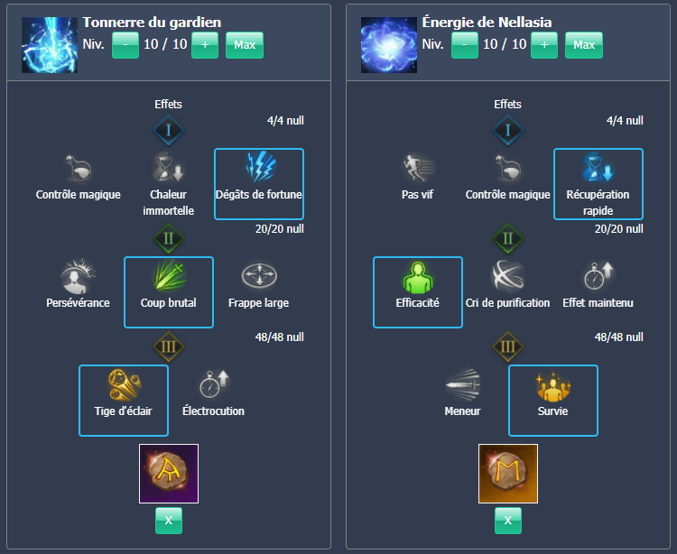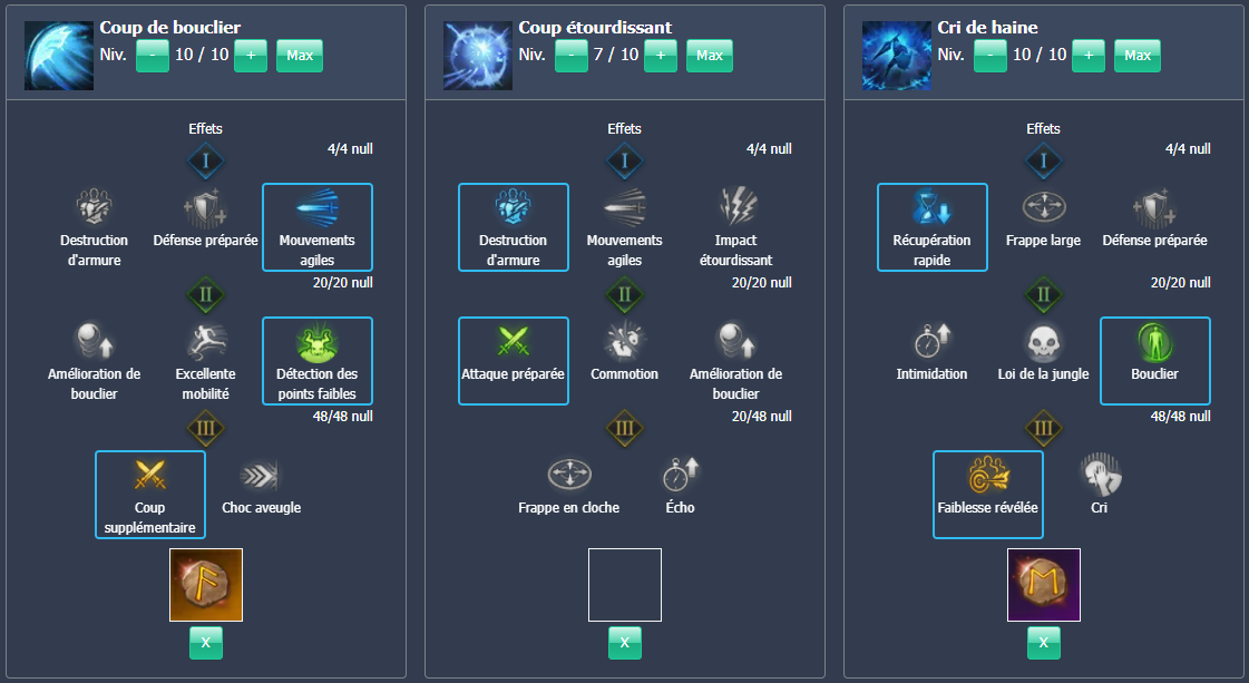 Pensez aussi à mettre une gemme d’annihilation de niveau 7 sur les compétences citées précédemment, sauf sur Coup étourdissant, Cri de haine et Énergie de Nellasia. Enfin pour ce