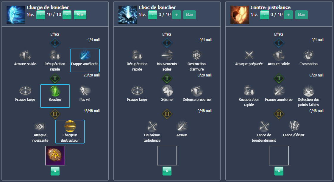 | Barricade | Les dégâts aux ennemis sont augmentés de 3 à 16% si vous êtes sous l’effet d’un bouclier |