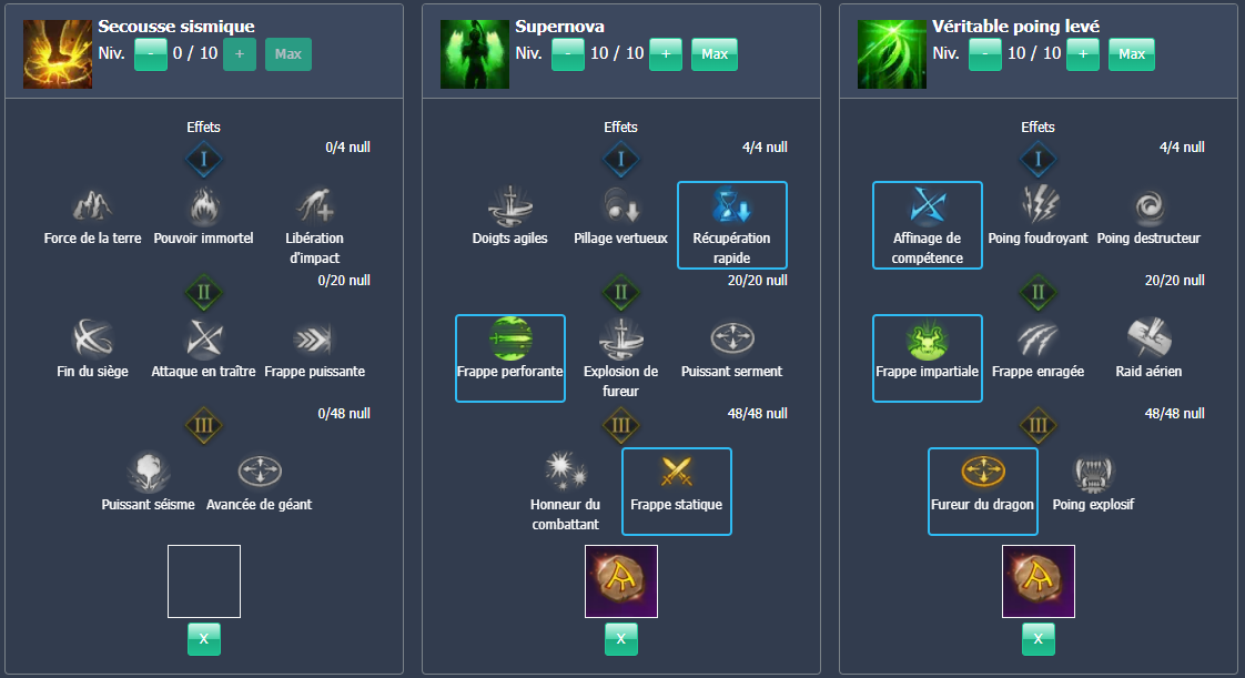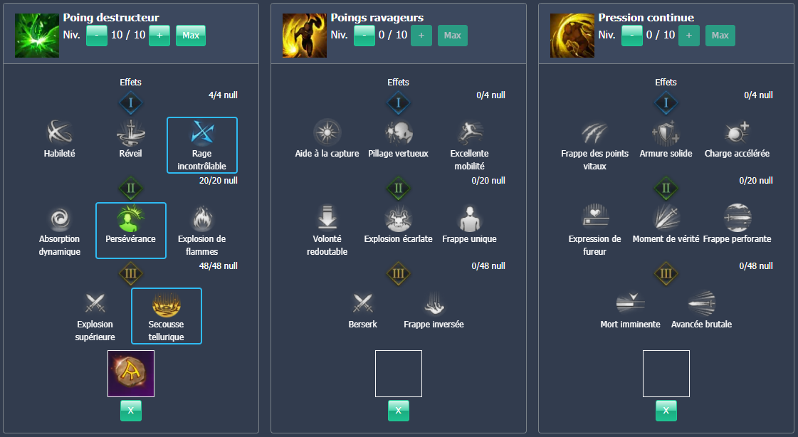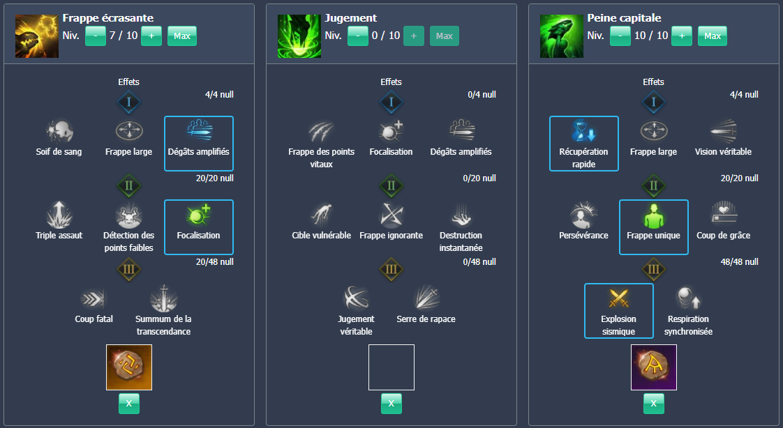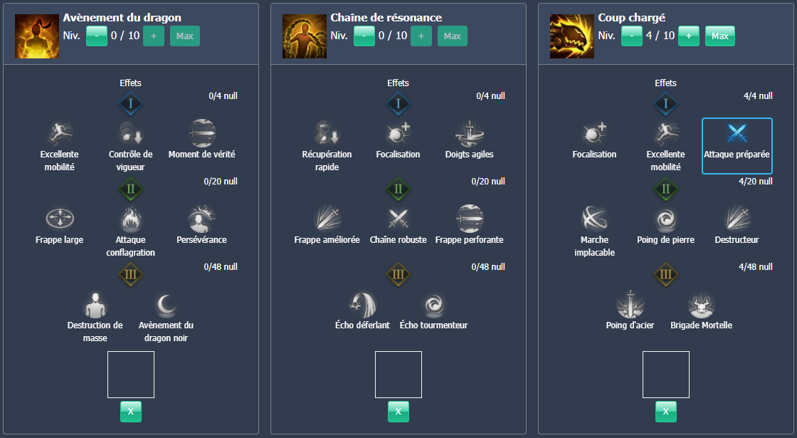 Pensez aussi à mettre une gemme d’annihilation de niveau 7 sur les compétences citées précédemment, sauf Coup chargé et Frappe du tigre féroce. Il est à noter qu’il vous faut