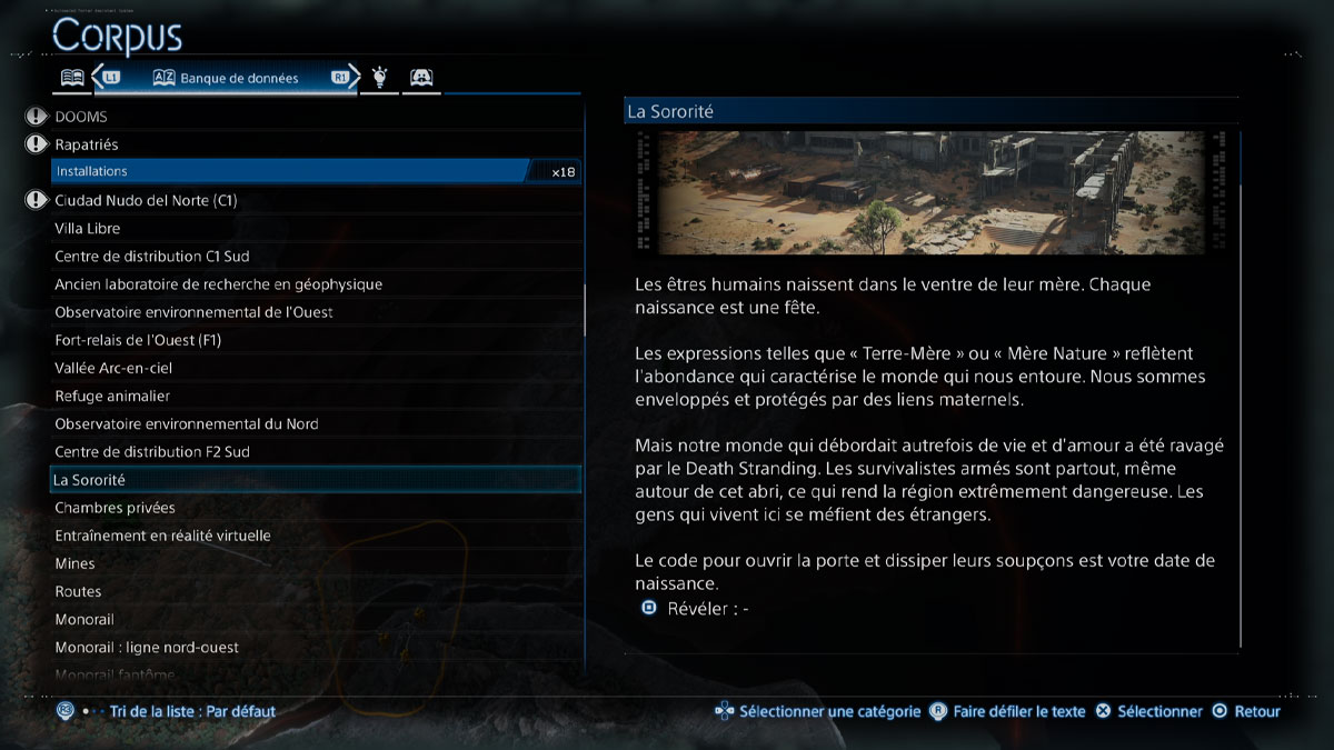 Pour vous rendre dans la banque de données, appuyez sur Rond puis R1 pour aller dans cette partie du Corpus, puis cherchez la Sororité parmi les différentes