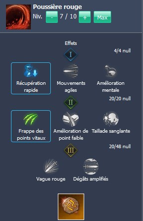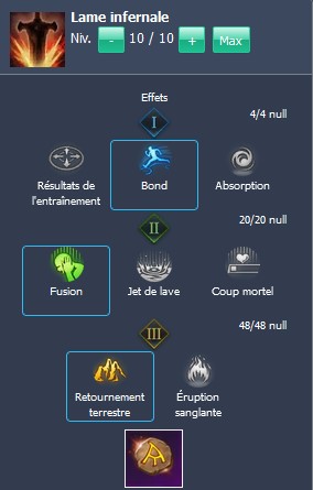 | Retour de flamme | Améliore de 4 à 20% les dégâts sur les boss ou monstres supérieurs. Dégâts subis +20% |