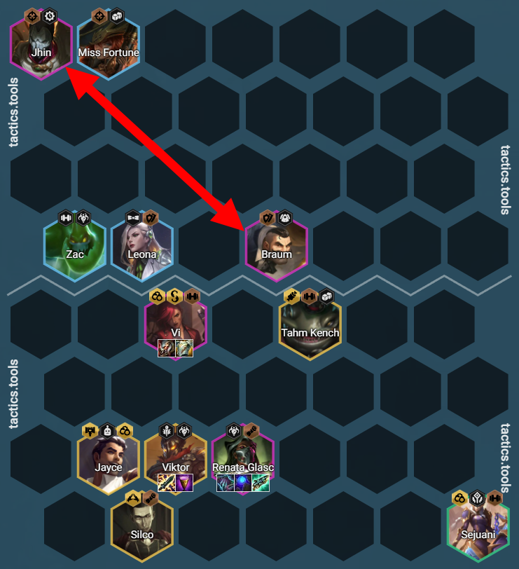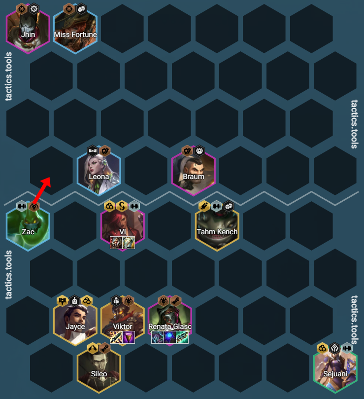 Viktor : Il faut qu’il soit dans les cases de Silco pour cast plus tôt. S’il a un Calice, mettez-le à côté de Renata.