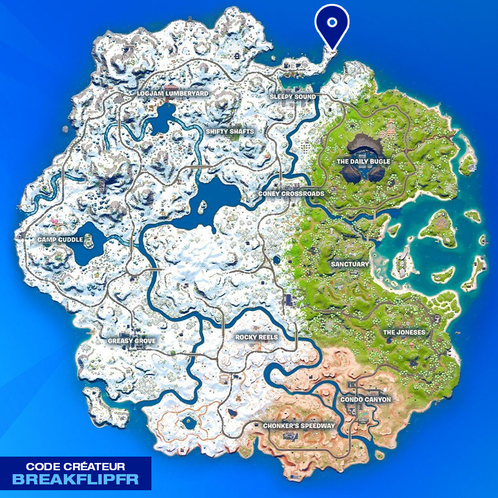 Pour trouver ce lieu notable dans Fortnite, rendez-vous à Sleepy Sounds. Au nord de la ville se trouve un bras de terre. Dirigez-vous vers l’extrémité de celui-ci