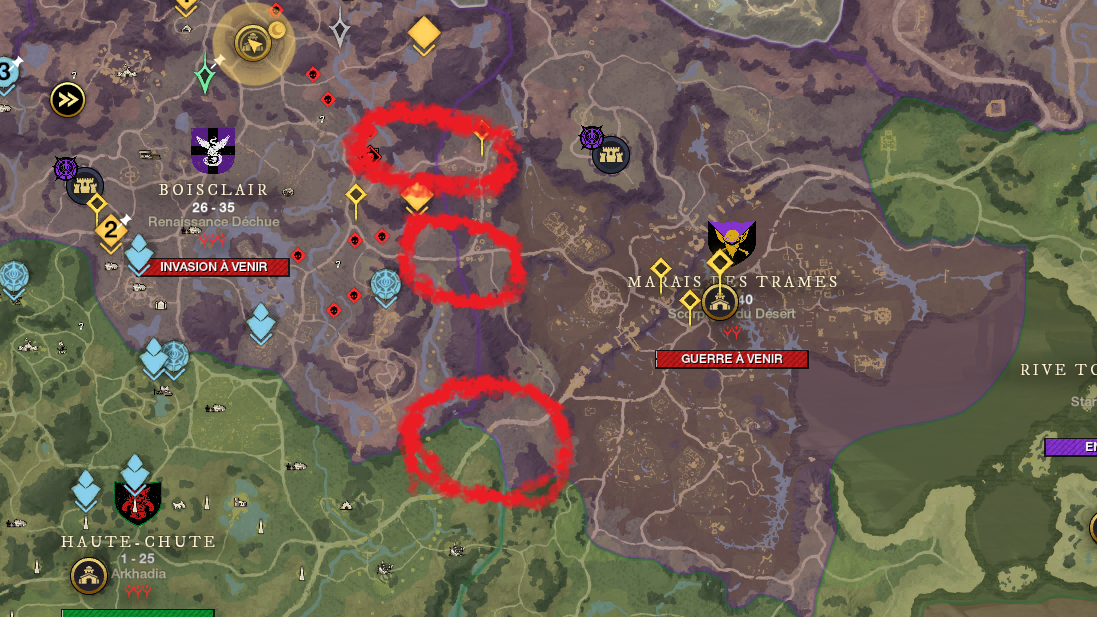 Gré-du-Vent ou les Falaises du Roy. Parmi les zones disponibles dans New World, on trouve le marais des trames, une zone accessible de niveau 30.