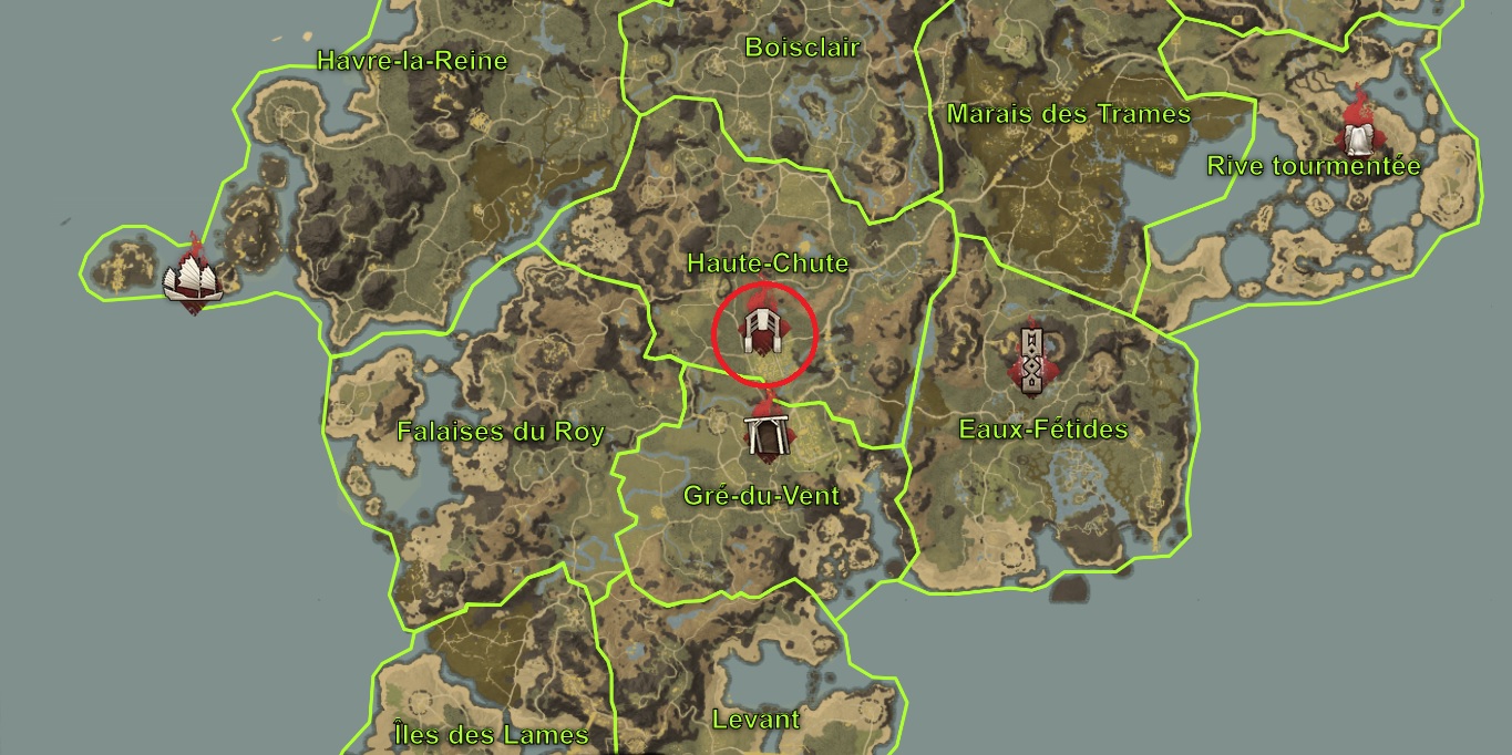 L’entrée du donjon de l’Obélisque brisée se trouve au sud de la zone de Haute-Chute, au centre de la carte. Retrouvez ci-dessous la carte pour y accéder.