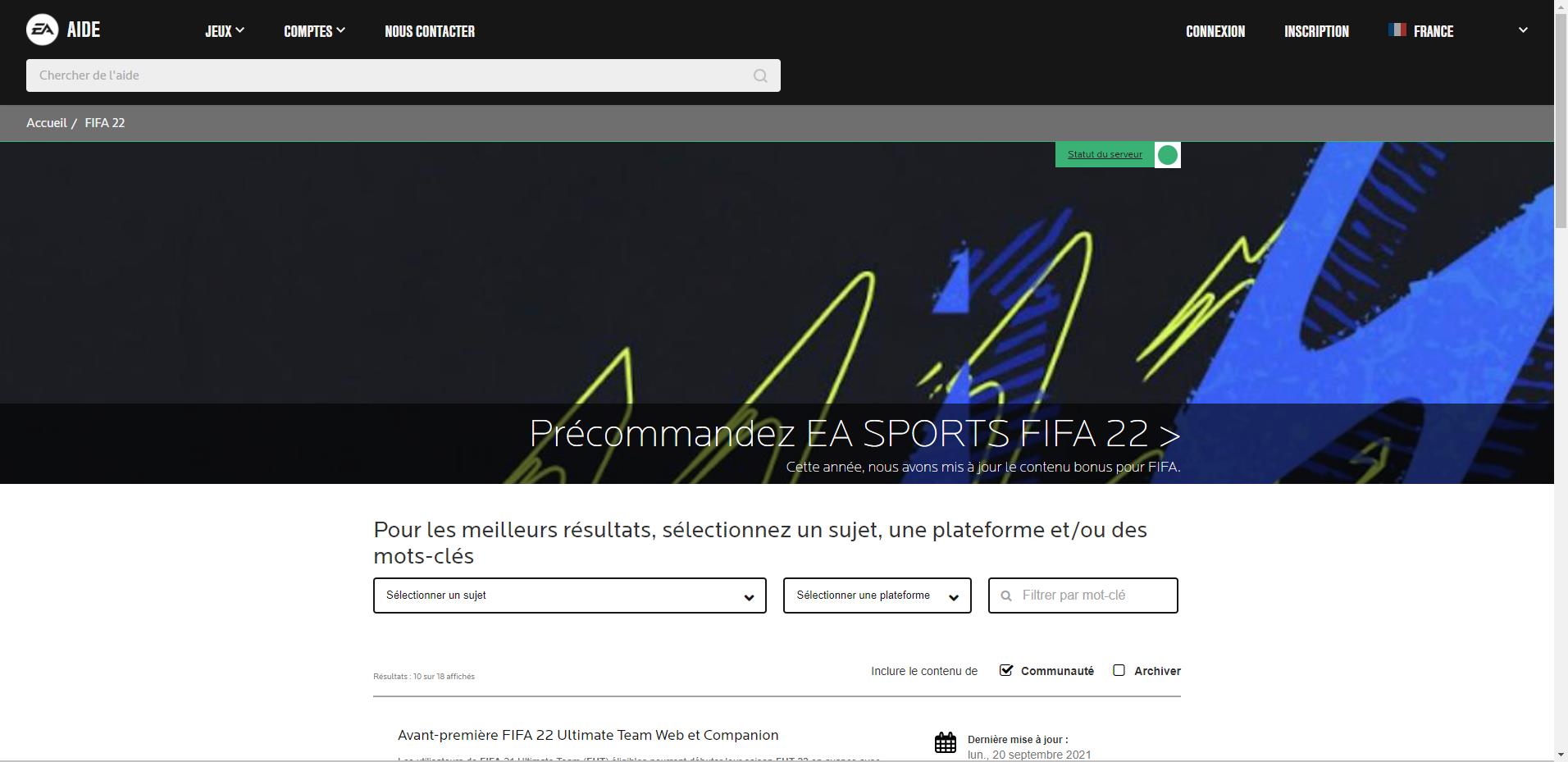 Pour savoir si les serveurs d’EA sont disponibles, rien de plus simple. Allez sur la page dédiée à FIFA 22 sur EA Help afin de vérifier si les serveurs sont en ligne (source). Comme vous le voyez ici sur l’image ci-dessous, il vous suffira ensuite de cliquer sur le