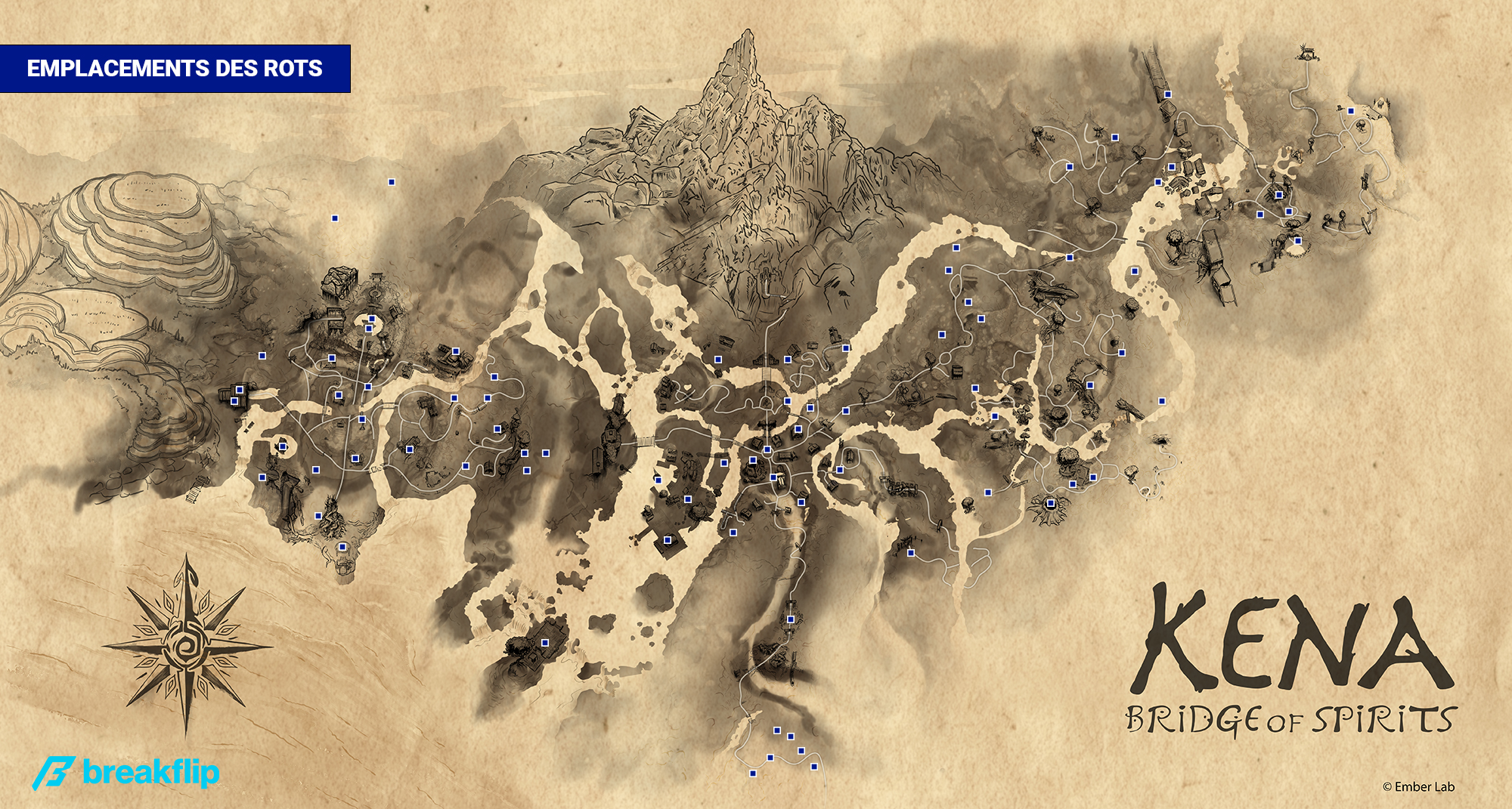 Voici la carte complète avec les 100 Rots de Kena Bridge of Spirits.