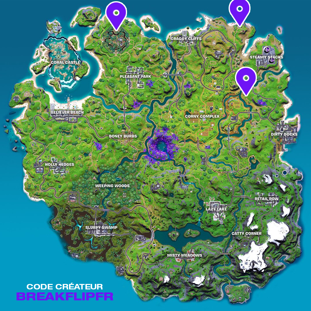 proposés par la quête. Le premier se trouve à Stealthy Stronghold, le second au nord de Steamy Stacks, et le dernier au sud de Steamy Stacks.