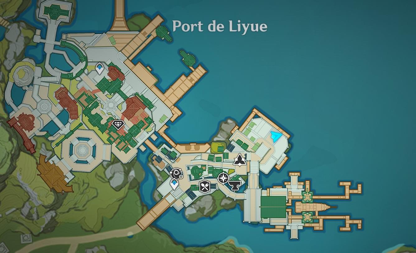 ». Une fois cela fait, vous allez devoir vous rendre au Port de Liyue, à l’emplacement de la flèche bleue ci-dessous afin de parler à Atsuko qui est