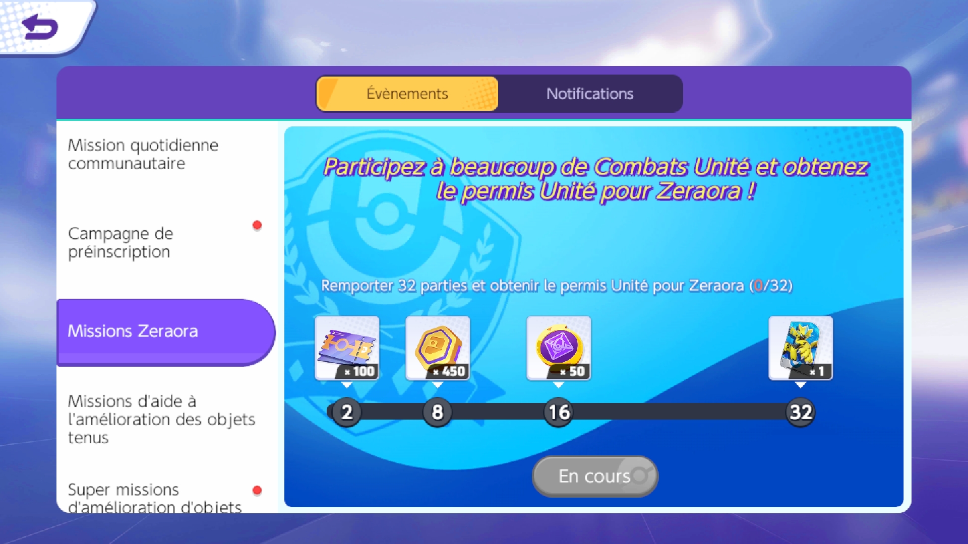 Mais sur mobile, la date étant dépassée, une nouvelle méthode existe pour débloquer Zeroara gratuitement. Un événement « Missions Zeraora » a été mis en place, pour y participer