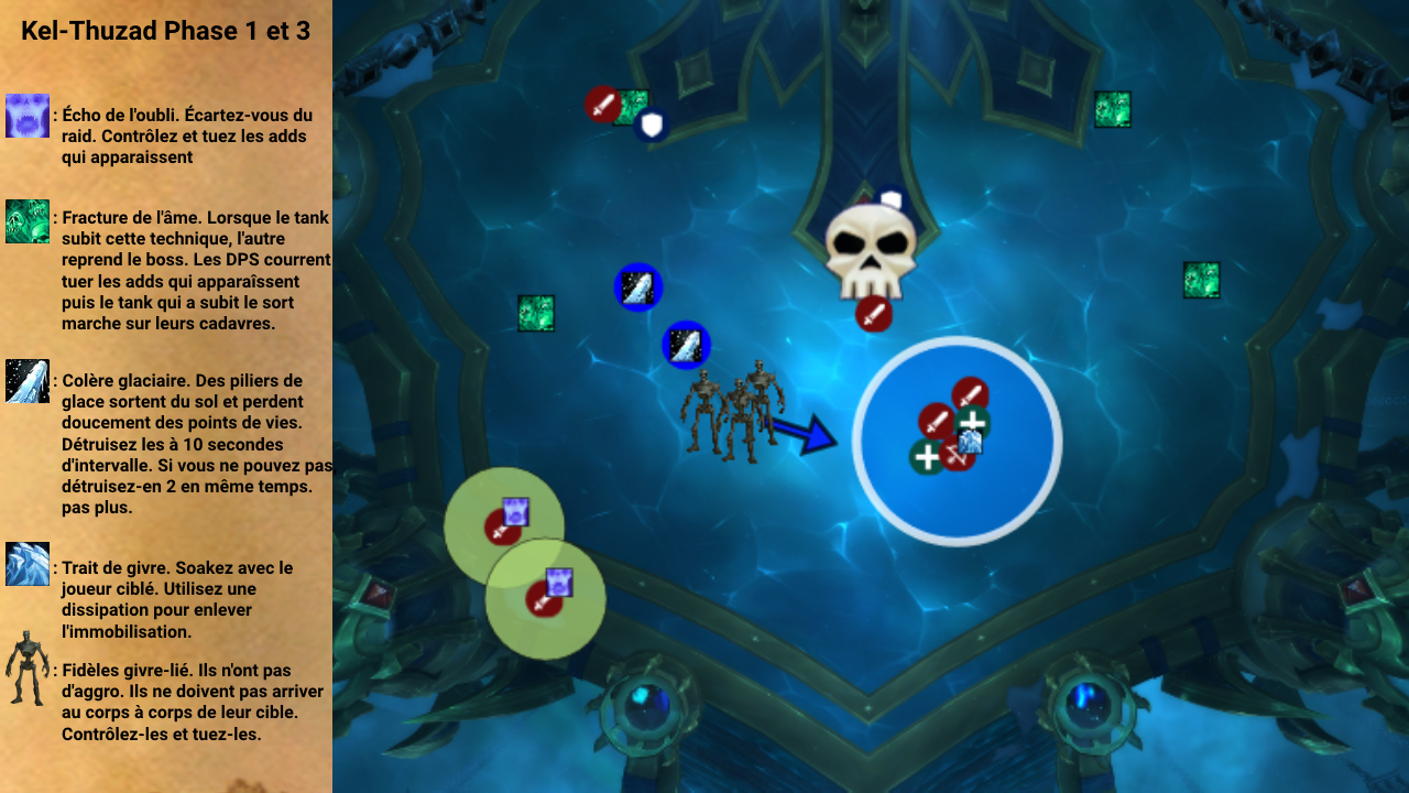 Dans la première phase vous affrontez Kel’Thuzad seul dans sa salle. Lors de la deuxième phase, le boss se replie dans son phylactère et invoque une armée d’adds. Une moitié du
