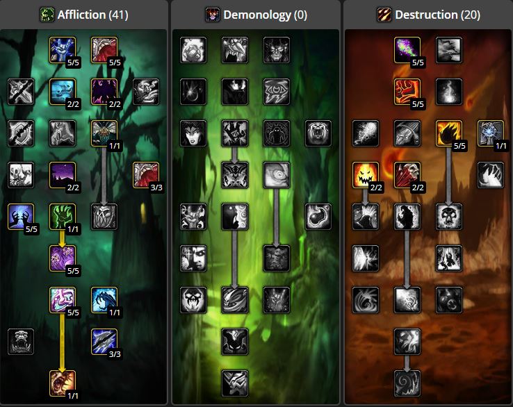 Retrouvez ci-dessous l’arbre de talents optimal du Démoniste Affliction sur World of Warcraft.