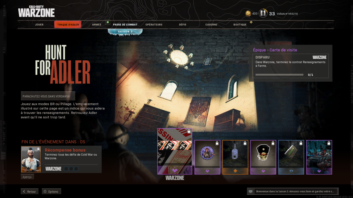 Un onglet dédié à l’événement Hunt for Adler est disponible dans Warzone et Cold War