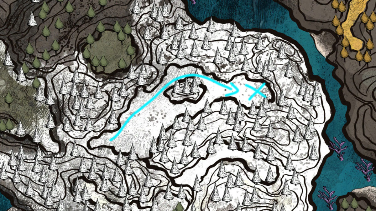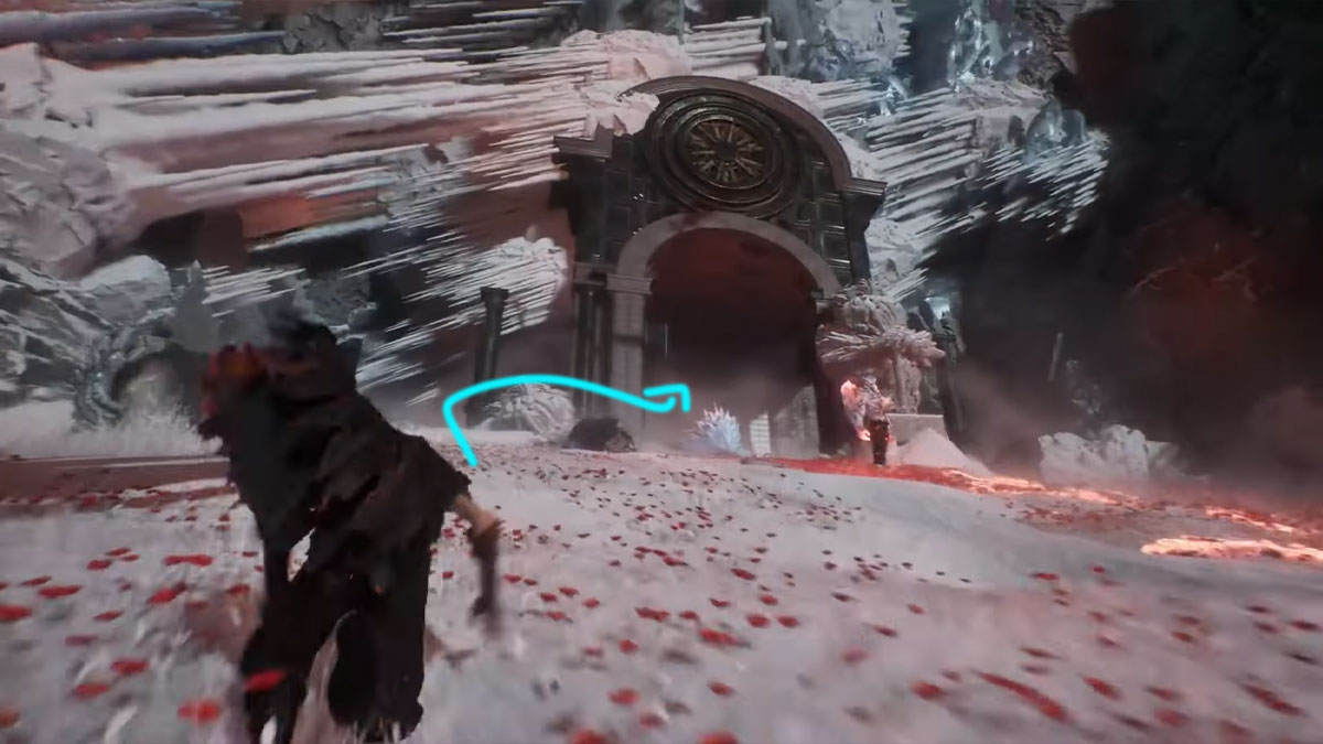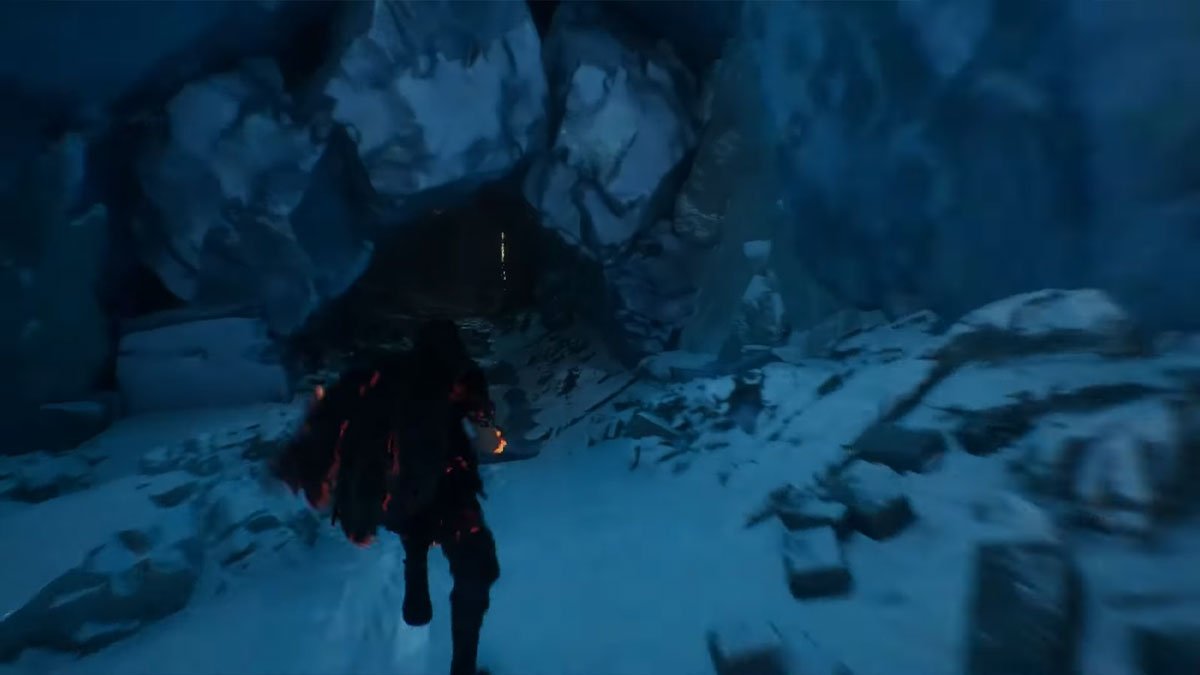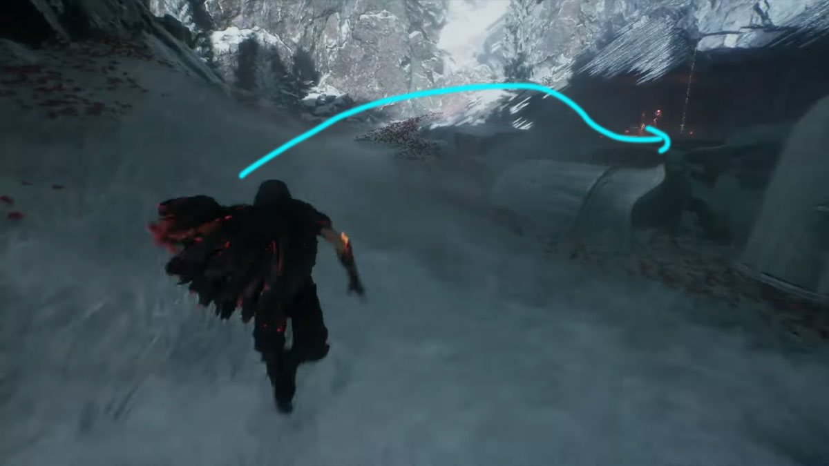 En entrant dans les Cœurs Gelés, vous trouverez un drapeau de point de repos. Depuis ce drapeau, restez sur le côté gauche où se trouve un Pelerin. Vous devriez apercevoir l’entrée d’une