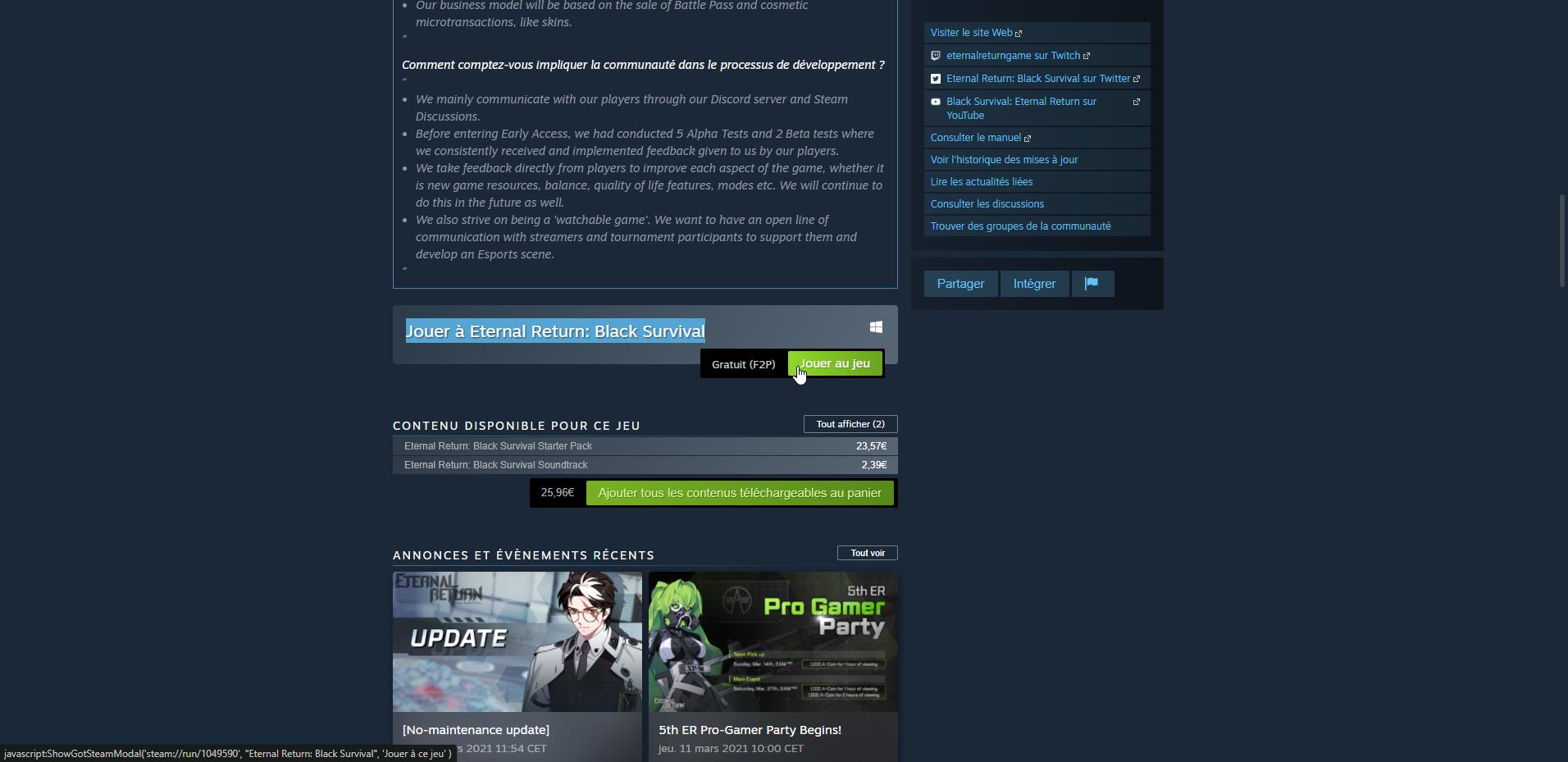 Il vous suffira donc de vous rendre sur la page du titre (source) et de cliquer sur le bouton « Jouer au jeu » dans le bandeau « Jouer à Eternal Return: Black Survival » comme vous pouvez le
