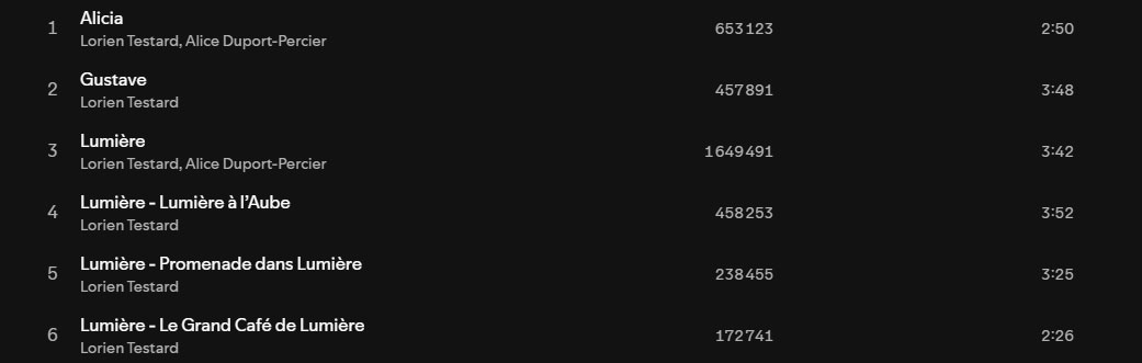En tout cas, Lumière est la chanson la plus écoutée sur Spotify parmi toute la BO de Clair Obscur: Expedition 33.