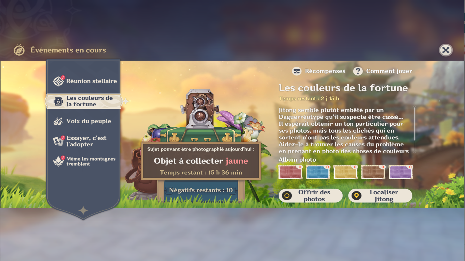 1.3 a offert à Genshin Impact de nouvelles features ! Vous pouvez depuis plusieurs jours participer à l’événement « Les couleurs de la fortune ». Vous devrez rapporter une