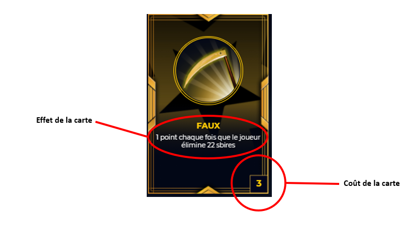 Les cartes objets se présentent ainsi. Comme pour les cartes joueurs, elles disposent d’un coût qui viendra s’ajouter à celui du joueur sur lequel l’objet sera placé. Au centre, son effet est